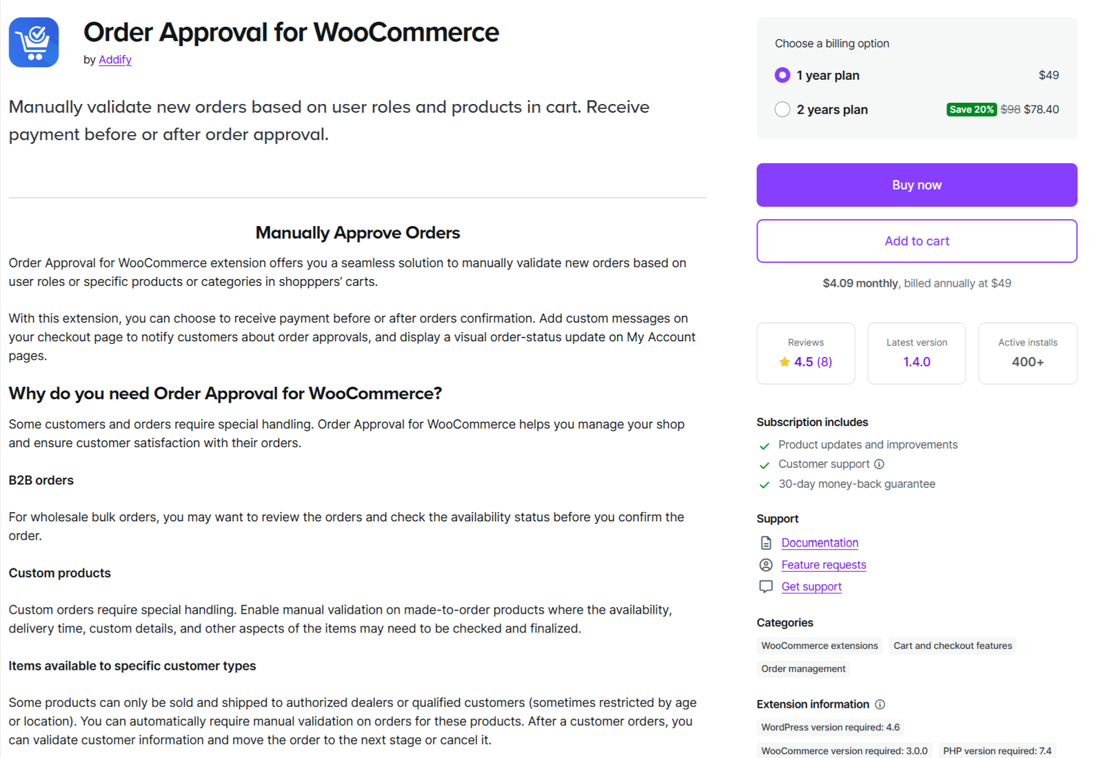 Order Approval for WooCommerce extension offers you a seamless solution to manually validate new orders based on user roles or specific products or categories in shopper carts. with this extension, you can choose to receive payment before or after orders confirmation. Add custom messages on your checkout page to notify customers about order approvals, and display a visual order-status update on My Account pages.
